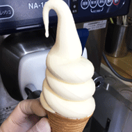 もともとソフトクリームの巻き方は、星のギザギザのような形ですが、この丸いソフトは角がなく、丸くてふっくらして、見た目も非常にかわいいらしいソフトクリームです。当店でももちろん店頭や移動販売でも販売しており大変人気の商品です。